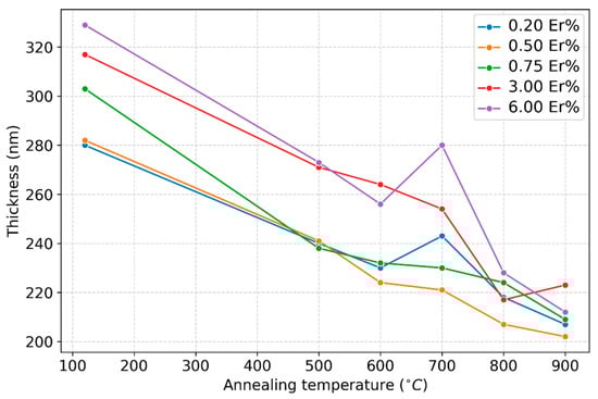 The thickness of the synthesized samples is presented in Figure 1. The thickness of the as-deposited films was found to increase with the Er doping concentration. In order to understand the relation between Er concentration and film thickness, one needs to first note that the source of Er was erbium nitrate pentahydrate. Increasing the concentration of erbium in the silica matrix required higher amounts of erbium nitrate, which eventually lowered the pH of the solution, making it more acidic, as it dissociated in water releasing (Er3+) and nitrate ions (NO3−). The nitrate ions hydrolyzed in water to produce nitric acid (HNO3) and hydroxide ions (OH−). The hydroxide ions then reacted with the metal alkoxide precursor to initiate the sol–gel reaction, while the nitric acid increased the acidity of the sol, lowering its pH. As a result, in the sol–gel process, hydrolysis became more dominant than condensation. The lower level of condensation resulted in a gel network that was more porous and weakly adherent. However, rare-earth ions with a relatively large radius, ranging from 0.868 to 1.36 Å [23], are able to compensate for this effect by inducing larger d spacing and lattice parameters of the species formed. This interplay between the increase in porosity and the incorporation of larger dopants resulted in an enhancement of the film thickness at higher erbium concentrations. Furthermore, a higher concentration of optically active Er sites within the silica matrix led to a higher photoluminescence efficiency at higher erbium concentrations. Upon annealing, the thickness of all processed films, regardless of the doping concentration, decreased as a consequence of the removal of the organic groups and residues during the sol–gel process. The shrinking taking place persisted up to 600 °C. Between 600 °C and 700 °C, an unexpected increase in thickness was clearly noticeable for all samples.