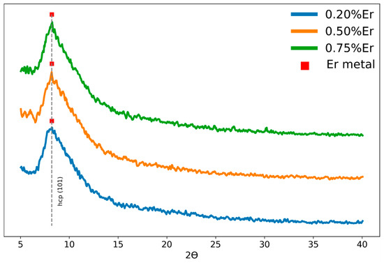 XRD pattern for 0.2%, 0.5 and 0.75% erbium-doped films on a Si substrate. The dashed line represents the (101) plane with the hcp space group [28].
