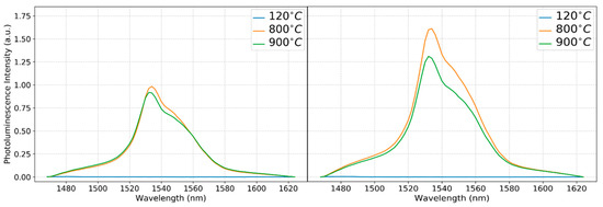 After annealing at temperatures ranging from 900 °C to 1150 °C, Gao et al. [22] showed four distinct erbium silicate polymorphs in the Er–Si–O films: Er2SiO5, y-Er2Si2O7, α-Er2Si2O7 and γ-Er2Si2O7, whereas annealing the Er silicates at higher temperatures led to more stable polymorphs. Moreover, at 1150 °C, the Er2SiO5 phase was found to be entirely converted into y-Er2Si2O7. In our case, as depicted in Figure 4, the deposited films exhibited varying intensities at various angles, which corresponded to different phases of the material. Specifically, the 33.3° angle indicates the presence of the triclinic-Er2Si2O7 phase, the 29.3° angle corresponds to the monoclinic-Er2Si2O7 phase, and both the 42.2° and the 47.6° angles represent the monoclinic-Er2SiO5 phase. In order to put things in perspective, the results in Figure 4 for y-Er2Si2O7 at 2θ = 33.3° for the various spectra were compared. For the 6% Er-containing samples, the peak for the samples annealed at 800 °C showed a 19% higher intensity compared to that for samples annealed at 900 °C. It was also found that for the samples annealed at 800 °C, the peak of the sample containing 6% Er was 73% higher that the peak of the 3% Er sample. The photoluminescence properties of these polymorphs exhibited a significant degree of diversity. The presence of these phases will be considered to further explain the photoluminescence behavior in the following section.
