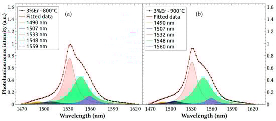 The same analysis, shown in Figure 7a,b, was performed for the experimental photoluminescence data spectra for the 6% Er-doped processed films. Again, it is noticed that the fitted data well correlated with the experimental data and that the prevailing five peaks shared the same wavelength positions. This again revealed that, in addition to the fact that the host or co-dopants had little effect on the 4f transitions, the Er doping concentration that was doubled from 3% to 6% did not cause dramatic shifts in the resolved peaks and discernible changes in optical activity, despite the higher chances for Er–Er segregation. One can notice, however, that the 6% Er concentration exhibited higher overall emission superposition of the resolved peaks as well as higher individual peaks and a larger area under the curve than the 3% concentration shown in Figure 6, proving that the followed process yielded even more highly optically active Er centers.