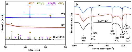 The XRD patterns of ZVI, BC, and B-nZVI/BC are shown in Figure 2a. The diffraction peaks of ZVI at 2θ of 44.7° and 65.0° were indexed as the (110) and (200) crystal planes of α-Fe0 (JCPDS-99-0064). BC displayed an amorphous carbon with 2θ from 20° to 25° [40]. Both the peaks of amorphous carbon and α-Fe0 were observed in B-nZVI/BC, demonstrating the successful formation of α-Fe0 on BC surfaces [44]. The diffraction peaks at 2θ of 24.1°, 33.2°, 49.5°, and 54.1° ascribing to Fe2O3 (JCPDS-99-0060) and 30.1°, 35.4°, 43.1°, 57.0°, and 62.5° corresponding to Fe3O4 (JCPDS-99-0073) were due to the oxidation of B-nZVI/BC in the air, leading to the formation of iron oxides [45,46]. In addition, crystalline material with peaks at 20.9° and 26.6° can be indexed as SiO2 (JCPDS-99-0088), which is a constituent of rice straw biochar [47].