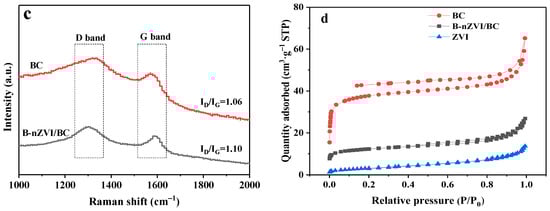 The N2 adsorption-desorption isotherms and porosity distributions of ZVI, BC, and B-nZVI/BC were illustrated in Figure 2d and Figure S1a. All of the adsorption-desorption isotherms were identified as type IV with a hysteresis loop, suggesting that mesopore structures (2 nm < pore size < 50 nm) existed in the prepared materials, which were further verified by the Barrett-Joyner-Halenda (BJH) pore size distribution. The pores in ZVI, BC, and B-nZVI/BC were distributed between 2 nm and 10 nm. From Figure S1b–d (in upplementary Materials), the average particle size of B-nZVI/BC was smaller, and the distribution was more uniform compared with raw ZVI and BC, which was due to the collision through the ball milling process. The SABET of ZVI, BC, and B-nZVI/BC were 11.9, 41.0, and 116.2 m2 g−1, respectively (Table S1).