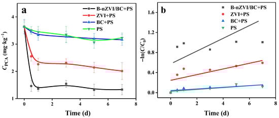 The removal of PCA with PS activated by ZVI, BC, and B-nZVI/BC was conducted, and the kinetic data are shown in Figure 3a. A control experiment in the absence of activators and PS was first carried out, which showed less than 5% PCA loss under the tested conditions after 7 d. With the addition of PS, the removal efficiency of PCA was 11.26%, which might be due to the activation of PS by iron-manganese compounds and organic matter in soil [10]. BC resulted in a PCA removal efficiency of 13.18% with the effect of adsorption and the weak activation property of carbon, and the presence of ZVI was attributed to a PCA removal efficiency of 44.78%. However, in the B-nZVI/BC-PS system, the concentration of PCA in soil was dramatically decreased from 3.64 mg kg−1 to 1.33 mg kg−1 with the addition of 4.8 g kg−1 B-nZVI/BC and 42.0 mmol L−1 PS, corresponding to a PCA removal efficiency of 63.46%. The concentration of PCA after reaction was much lower than the calculated remediation target value of 1.96 mg kg−1 for soil.