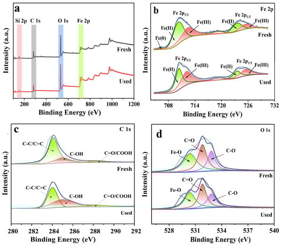 To explore the possible activation mechanism of PS by B-nZVI/BC, XPS characterization was utilized to determine the chemical status and chemical composition of B-nZVI/BC before and after the reaction. Compared with fresh B-nZVI/BC, the atomic percentage of O increased from 47.29% to 50.42%, and the percentages of C and Fe decreased from 29.4% to 25.5% and from 6.44% to 6.42%, respectively, after the reaction (Figure 5a and Figure S4). The increased O content suggested that the B-nZVI/BC was oxidized during the PS activation process, and the decreased C and Fe content indicated that C and Fe participated in the PS activation. After the reaction, it was also found that the surface of B-nZVI/BC became rough (Figure S5).