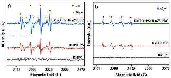 EPR measurements for SO4•−, •OH (a), and O2•− (the EPR spectrometric detection of O2•− was performed in DMSO solution, which was designed to avoid the influence of SO4•− and •OH) (b) in various activated PS systems. Reaction conditions: [PS]0 = 42.0 mmol L−1, [DMSO]: [H2O] =9:1 (volume ratio), [DMPO] = 200.0 mmol L−1, [B-nZVI/BC]0 = 4.8 g kg−1, pH0 = 7.49, and T = 25 °C.