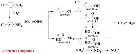 In an oxidative system for the degradation of PCA, cationic radicals were first generated and further oxidized to release chloride ions and/or ammonium ions. The intermediates were decomposed into small molecular organic acids or alcohols after the benzene ring was opened [68]. In order to explore the degradation pathways of PCA, derivatization experiments were carried out with silanization reagents to detect the intermediate products by GC-MS. As shown in Figure S10, six organic intermediates were identified. 1-chlorobutane (tR = 3.501 min, m/z = 92.6) and the derivatized product of glycine (tR = 14.173 min, m/z = 165.3) were detected, which might be caused by carbon chain breakage after the benzene ring of PCA was opened. Other derivatives of organic acids and alcohols with four carbon atoms were also measured, including the derivatized products of butanol (tR = 23.990 min, m/z = 104.2) and butanol acid (tR = 7.650 min, m/z = 118.2). Derivatives of small organic acids or alcohols with two carbon atoms, including ethylene glycol (tR = 9.774 min, m/z = 122.3) and glycolic acid (tR = 14.087 min, m/z = 136.3), were also determined, which might be due to the chain scission of long-chain carbon-containing organics.