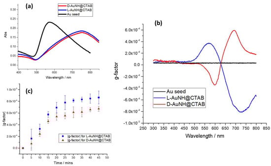 (a) UV-Vis spectra and (b) ECD spectra of Au@CTAB seed and chiral AuNPs. Black line is the absorption spectrum of the Au seeds, blue line is the profile of the plasmonic peak of L−AuNH@CTAB, and red line is related to D−AuNH@CTAB nanoparticles. (c) g-factor intensity of L−AuNH@CTAB and D−AuNH@CTAB was monitored during the experiment at 37 °C in the last step of the synthesis procedure.