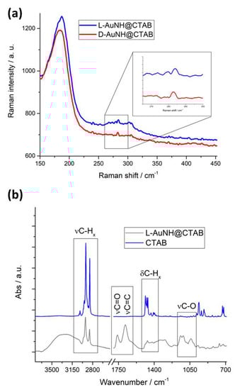 (a) Raman spectrum of L−AuNH@CTAB (blue line) and D-AuNH@CTAB (red line) in the region of interest 150–450 cm−1. (b) FTIR spectra of L−AuNH@CTAB (black spectrum) and CTAB (blue line).