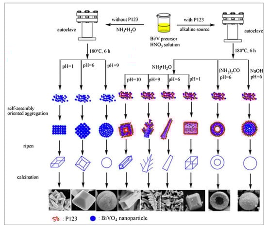 - Chen, L.; Meng, D.; Wu, X.; Wang, J.; Wang, Y.; Liang, Y. Shape-Controlled Synthesis of Novel Self-Assembled BiVO4 Hierarchical Structures with Enhanced Visible Light Photocatalytic Performances. Mater. Lett. 2016, 176, 143–146. [Google Scholar] [CrossRef]