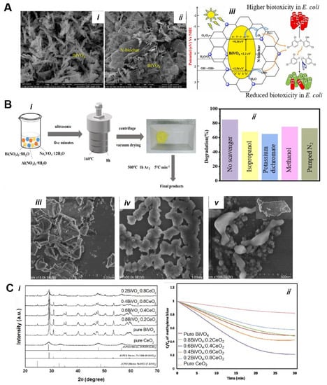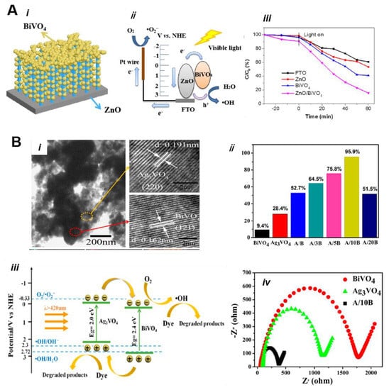 - Zhong, X.; Li, Y.; Wu, H.; Xie, R. Recent Progress in BiVO4-Based Heterojunction Nanomaterials for Photocatalytic Applications. Mater. Sci. Eng. B 2023, 289, 116278. [Google Scholar] [CrossRef]