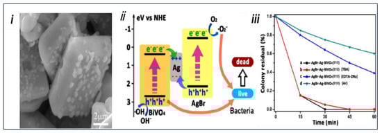 - Bao, S.; Wang, Z.; Zhang, J.; Tian, B. Facet-Heterojunction-Based Z-Scheme BiVO4{010} Microplates Decorated with AgBr-Ag Nanoparticles for the Photocatalytic Inactivation of Bacteria and the Decomposition of Organic Contaminants. ACS Appl. Nano Mater. 2020, 3, 8604–8617. [Google Scholar] [CrossRef]