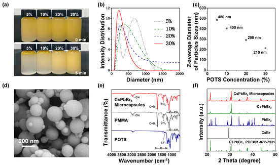 (a) Oil-in-fluorine emulsion prepared at different POTS concentrations. Photos were taken immediately (top row) and 5 min after initial emulsification (bottom row); (b) the effect of POTS concentrations on the particle size distribution of CsPbBr3 microcapsules; (c) the mean particle diameter; (d) scanning electron microscopy (SEM) image of the CsPbBr3 microcapsules; (e) FT-IR spectra of CsPbBr3 microcapsules, PMMA, and POTS; (f) XRD pattern for the CsPbBr3 microcapsules, pure CsPbBr3 perovskite, PbBr2, and CsBr.