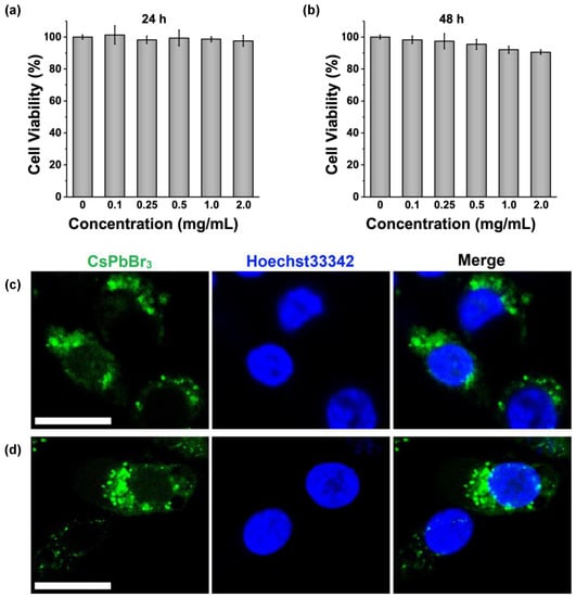 (a) Cellular viability of MCF-7 cells after 24 h and (b) 48 h of incubation with CsPbBr3 microcapsules; (c) confocal fluorescence microscopy images of MCF-7 cells after 6 h and (d) 12 h of incubation with CsPbBr3 microcapsules. Scale bars are 20 µm.