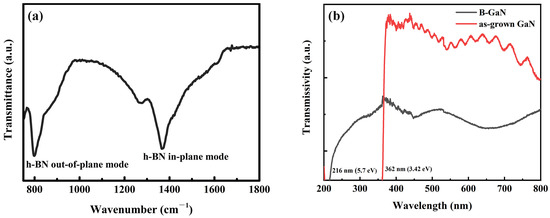 Fourier Transform Infrared Spectrometer (FTIR), which has been widely used for BN characterization, can also be applied for differentiating the crystal orientation of h-BN by providing information about the vibrational modes in it. The typical FTIR image of h-BN has a peak at ~800 cm−1 (out-of-plane B-N-B bending mode absorption peak) and another peak at ~1380 cm−1 (in-plane B-N stretch mode) [27]. Technically, h-BN planes exhibit an Infrared (IR) active mode at 800 cm−1, which is forbidden in the case of an IR beam with normal incidence. Therefore, when FTIR measures along the c-axis of h-BN, the in-plane mode is usually dominant. However, when the measurement is perpendicular to the c-axis, the out-of-plane mode is expected to intensify gradually [28]. In this work, the signals of the in-plane mode and the out-of-plane mode were recorded at 798.5 cm−1 and 1369.4 cm−1 (shown in Figure 5a), respectively. The ratio between the integrated intensities of the two modes was 69.73% (Iout/Iin). This provides evidence that the h-BN is vertically synthesized on GaN on a larger scale. The absorption edges of 5.9 eV in transmissivity measurements performed by UV–vis also suggest the formation of h-BN (shown in Figure 5b).