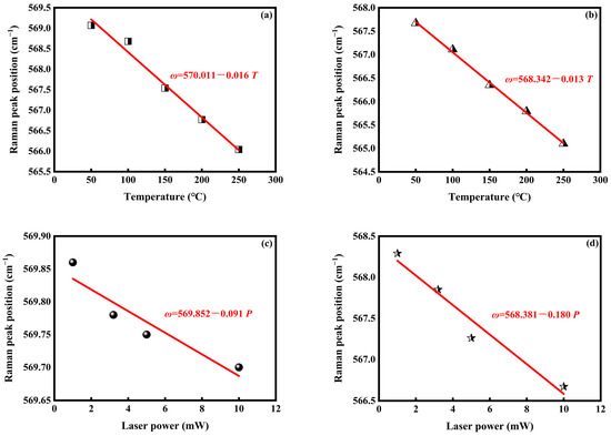 The temperature- and excitation-power-dependence Raman measurements were repeated many times, and a good linear relationship between peak position and the temperature and the laser power was identified. Therefore, Equation (4) can be rewritten in differential form as: