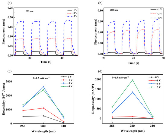 (a) Photocurrent as a function of time under −1 V, −3 V, and −5 V bias voltages under illumination of 1.5 mW/cm2 for 255 nm, respectively. (b) Photocurrent as a function of time under −1 V, −3 V, and −5 V bias voltages under illumination of 1.5 mW/cm2 for 280 nm, respectively. (c) Responsivity as a function of illumination wavelength under 0 V, −1 V, −3 V, and −5 V bias voltages with 1.5 mW/cm2 illumination, respectively. (d) Detectivity as a function of illumination wavelength under 0 V, −1 V, −3 V, and −5 V bias voltages with 1.5 mW/cm2 illumination, respectively.