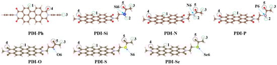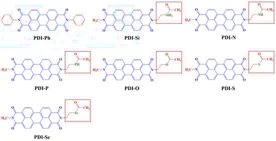 Framework of the available ETM (PDI-Ph) and designed ETMs (PDI-Si, PDI-N, PDI-P, PDI-O, PDI-S, and PDI-Se) (own elaboration).