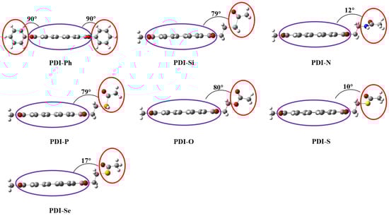 The optimized geometries of investigated PDIs. The dihedral angles are shown on each structure. The optimized parameters of all PDIs are provided in the Supplementary Materials Table S2.