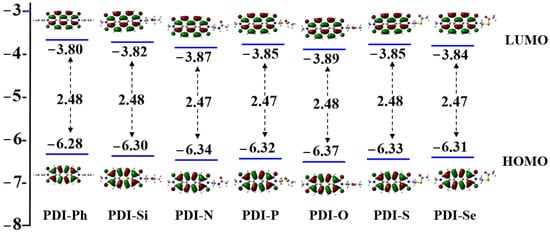 The properties of frontier molecular orbital (FMO), including the HOMO, LUMO, and LUMO-HOMO gap, were calculated for the PDIs, as shown in Figure 3. It can be seen that asymmetrical geometries and various heteroatoms have little effect on the distribution of HOMO and LUMO, which mainly originate from the contribution of the PDI backbone. In PDI-Ph and As-PDIs, the HOMO and LUMO are fully delocalized on the PDI core, respectively, suggesting strong π-π intermolecular interactions, which increase the possibilities of π-π overlap between neighboring moieties and improve carrier transfer. As suggested in an earlier study, the experimentally measured HOMO (−5.98 eV) and LUMO (−3.92 eV) energies for PDI-Ph are in the range of energy levels for ideal ETMs (HOMOs are below −5.40 eV, LUMOs are between −4.20 and −3.90 eV) in MAPbI3 PSCs [50]. There is a small difference between the calculated HOMO (−6.28 eV) and LUMO (−3.80 eV) energies of PDI-Ph (0.30 eV for HOMO and 0.12 eV for LUMO) with experimentally measured data. The values for designed PDIs are slightly smaller (with a deviation of 0.02~0.09 eV) than PDI-Ph. The results indicate that designed molecules have well-matched energy levels with MAPbI3, which may allow the electrons to transfer frequently from perovskite to ETMs; on the other hand, holes may be prevented from perovskite to ETMs [51]. As a result, hole-electron recombination could be largely decreased, which is beneficial for the improvement of PSC performance. In addition, it is worth noting that the LUMO-HOMO energy gaps for PDI-Si (2.48 eV) PDI-N (2.47 eV), PDI-P (2.47 eV), PDI-O (2.48 eV), PDI-S (2.48 eV), and PDI-Se (2.47 eV) are adjacent to the value of PDI-Ph (2.48 eV), indicating similar abilities to prohibit hole-electron recombination in asymmetrical and symmetrical ETMs. In addition, the smaller LUMO energies in As-PDIs compared to PDI-Ph explain the better electron extraction ability and environmental stability, ascribed to the introduction of a Lewis base heteroatom [52].
