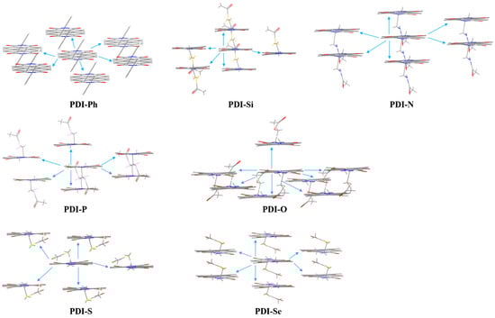 As listed in Table 2, kelectrons in PDI-Si, PDI-N, PDI-P, PDI-S, and PDI-Se have the same order of magnitude (1013 s−1) as that of PDI-Ph, while PDI-O has an even greater kelectron (1.58 × 1014 s−1), suggesting largely improved electron transfer ability of PDI-O. Correspondingly, high values of μelectron (0.57~5.94 cm2 V−1 s−1) were found in the new PDIs, in the order of PDI-O > PDI-S > PDI-Se > PDI-P > PDI-N > PDI-Si. Excitingly, increased electron mobility was observed in PDI-O (5.94 cm2 V−1 s−1), PDI-S (3.52 cm2 V−1 s−1), and PDI-Se (3.06 cm2 V−1 s−1) compared to PDI-Ph (2.18 cm2 V−1 s−1). The varying electron mobility of these materials was mainly ascribed to the variation of reorganization energy, transfer integral, and centroid-to-centroid distance between adjacent molecules in the main pathway of electron transfer, which was strongly influenced by frontier molecular orbitals and crystal structure. The values of hole mobility (μhole) indicate that most of the designed molecules also have good hole transportation performance, as shown in Table S5. The results suggest that the introduction of heteroatom-modified functional groups—especially the introduction of oxygen, sulfur, and selenium—with methyl in PDIs, to form asymmetrical geometries, has a great impact on the refinement of electron transfer properties.