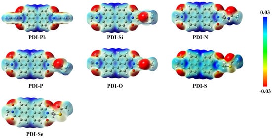Electrostatic potential (ESP) mapped onto a surface of electron distribution for studied PDIs.