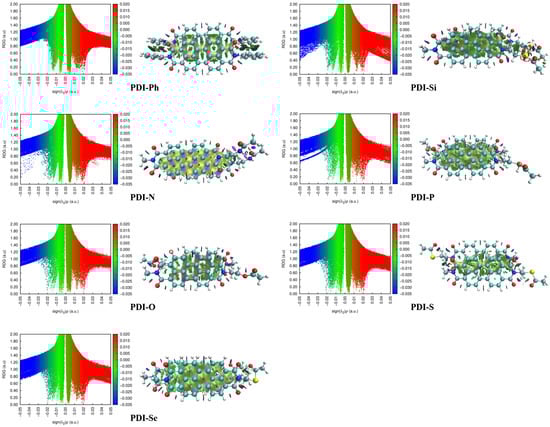 For the purpose of obtaining more insight into the molecular packing style in the crystal, the non-covalent interaction in the dimers with the largest transfer integral of the studied PDIs was investigated by the analysis of reduced-density gradients (RDGs). As shown in Figure 6, the low-gradient spikes in the left column of each molecule appear near zero, while the isosurface images in the right column of each molecule are green. The large van der Waals interactions in PDI-Ph, PDI-Si, PDI-N, PDI-P, PDI-O, PDI-S, and PDI-Se lead to the crystal packing of π-π motifs. The non-covalent interaction is stronger in the following order: PDI-S < PDI-P < PDI-Si < PDI-O < PDI-N < PDI-Se < PDI-Ph, which is inverse to the intermolecular distance discussed earlier (molecular stacking).