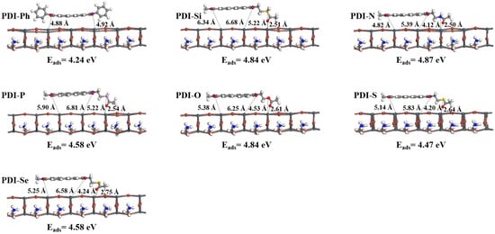 The geometries of the ETMs adsorbed on the perovskite surface were optimized and are shown in Figure 8. As shown in Figure 8, the PDI skeleton in As-PDIs is nearly parallel to the perovskite surface. For PDI-Ph, the N (in the PDI backbone) interacting with Pb (in the perovskite surface) leads to efficient adsorption of ETM on perovskite, with N…Pb distances of 4.88 and 4.92 Å, respectively. For designed PDIs, in addition to the interaction of N in the PDI backbone with Pb, additional interaction between the Lewis base heteroatom or double bond oxygen in the side chain and Pb in the perovskite surface were found. The heteroatom…Pb and double bond oxygen…Pb distances between new ETMs and perovskite surface, displayed in Figure 8, were 4.12~5.22 Å and 2.50~2.75 Å, respectively. Correspondingly, the structural modification in ETMs leads to the variation of adsorption energies (Eads), as listed in Figure 8. The larger Eads for designed ETMs than that of PDI-Ph indicated improved adsorption performance with the appearance of Lewis base heteroatoms Si, N, P, O, S, or Se in the molecular functional groups. The different Eads of designed ETMs on perovskite surface (the largest variation of 0.40 eV) explained the influence of various heteroatoms on the interface interaction.
