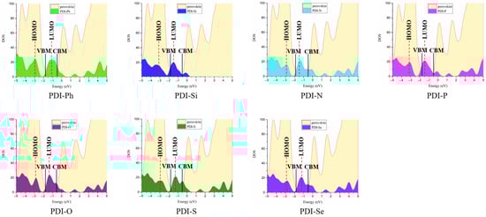 Density of states (DOS) of perovskite/ETMs with separate contributions from perovskite and ETMs (PDI-Ph, PDI-Si, PDI-N, PDI-P, PDI-O, PDI-S, and PDI-Se).