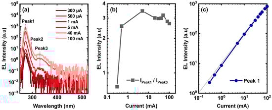 (a) EL spectra of the initial UVC LED at different injected currents. (b) The intensity ratio between the dominant emission (Peak1) and lower energy emission (Peak3). (c) Correlation between the emission intensity of Peak1 and injected current.