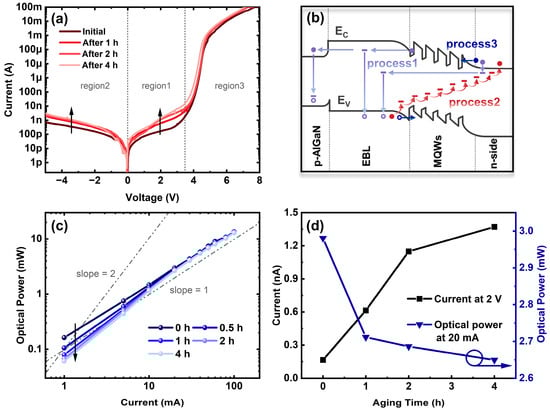 We further established the corresponding physical models for the three regions above, as shown in Figure 3b. For region1, the forward subthreshold current was typically caused by TAT, that the traps in the MQWs or EBL could assist electrons from escaping towards the p-side, which can be modeled as the superposition of an ideal diode and a parallel resistor [24] (process1 in Figure 4b). We found in Figure 4a that the forward subthreshold current already existed before stress, indicating the presence of TAT-related defects within the as-grown AlGaN MQWs. Therefore, it can be inferred that trap-related electron leakage was the main cause of the parasitic emission of Peak3 in Figure 3a. The increase in the forward subthreshold current after stress is mostly related to the activation of these as-grown defects. With the L–I curves measured on the UVC LEDs during stress (Figure 4c), Figure 4d shows the dependence of the forward subthreshold current and optical power of the LED on the aging time. With increasing aging time, the subthreshold current rapidly increases, while the optical power dramatically decreases. Thus, it can be concluded that the significant degradation of UVC LEDs in the early stage of aging is primarily caused by electron leakage.