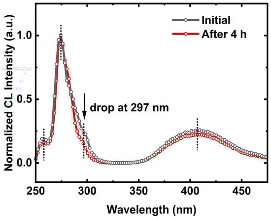 To study the origin of the electron leakage, we compared the normalized integrated CL spectra in the hillock area on the UVC LEDs before and after stress. As shown in Figure 5, the weak parasitic peak at 260 nm in the CL spectra originated from the band-to-band transition of the underlying n-AlGaN. The dominant emission includes the main peak at 274 nm and a weak shoulder at 297 nm, corresponding to the emission from the hillock-free area and hillock top-edges, respectively. The additional broad emission band at 410 nm typically originates from the deep-level recombination, which is involved in and complex related transitions of n-AlGaN [29]. A careful comparison between the CL spectra and EL spectra (Figure 3a) revealed the absence of the emission centered around 330 nm in the CL spectra. This also illustrates that the parasitic emission at around 330 nm in the EL spectra is mainly attributed to the electron leakage into the p-side, under the electric field, since CL excitation only occurs along the penetration path with the emission intensity closely related to the layer thickness. Moreover, it is interesting that the near-band emission intensity of the CL spectra remains stationary after stress, while the intensity of the shoulder at 297 nm exhibits an obvious drop. Since the lower energy emission of 297 nm is from the hillock top edges, as shown in Figure 2d, it is considered that the electron leakage is closely related to the hillock top edges.