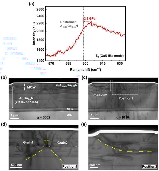 Such a large total compressive stress has been partly released by the generation of hillocks and dislocations. Figure 6b,c show the bright-field TEM images of one hillock with and , respectively, from which dislocations with Burgers vectors of type a and (a + c) are mainly distributed in AlGaN layers. It can be seen that the AlGaN layer on the SL transition layers presents a sharp interface in the pre-growth stage, yet then, roughens by forming hillock grains as the total strain energy increases with thickness. As shown in position1 (Figure 6d), grain1 and grain2 have been gradually generated to relax the compressive strain. As the grain grows, the dislocations would bend towards the side facet of the grain (see yellow arrows), leading to substantial TDs bunching at the step edges. It is noteworthy that the grain coalescence has produced a larger hillock, the center of which corresponds to the grain boundary and generates a large number of fresh TDs due to the inherent twist or tilt of adjacent grains [11]. These newly formed TDs that are the channel of strain relaxation will cause leakages and finally affect the reliability of the device. As shown in position2 in Figure 6e, the further growth of the hillock would also drive the TDs bending and bunching towards the side facet due to the mirror force, which is consistent with the area of the lower luminescence and higher leakage.