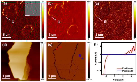 Tof-SIMS mappings of C (a), O (b), and Si (c) over hillocks of the n-AlGaN sample. The inset in (a) shows the SEM image of the analyzed region. (d) Surface morphology and (e) C-AFM current mapping of the hillock at sample-to-tip voltage of −5 V. (f) Local I–V curves at position A and position B in (e).