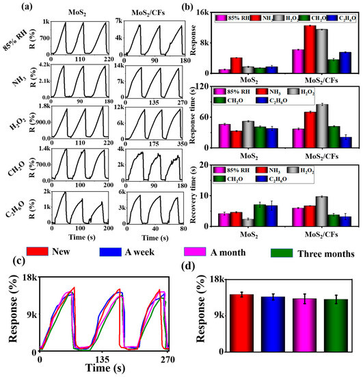 (a) Gas-sensitive response of sensors prepared using MoS2 and MoS2/CFs; (b) comparison of response size, response time and recovery time of MoS2 and MoS2/CFs; (c,d) long-term stability test of MoS2/CFs to 1000 ppm NH3.