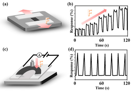 (a) Schematic diagram of material stretching, (b) change in current signal flowing inside the material for increasing stretching force, (c) schematic diagram of applying a fixed force to the bent material, (d) change in current signal flowing inside the material.