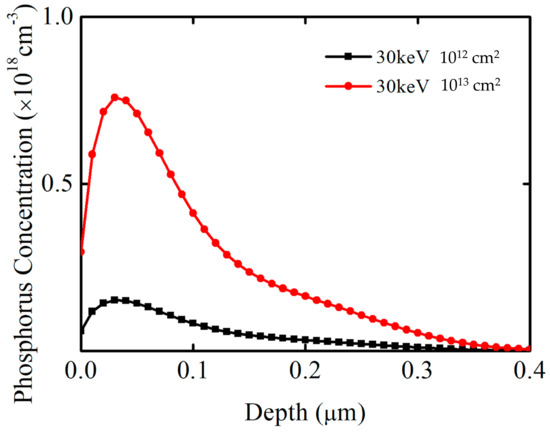 The samples used in this study included commercially available n-type epitaxial 4H-SiC wafers that were (4.0 ± 0.5)° off-axis toward <11–20>. The MOS capacitors were fabricated on the (0001) plane face. The thickness of the epilayer was 10 µm, and the concentration was (5.06–10.62) × 1015 cm−3. First, the standard Radio Corporation of America (RCA) cleaning process was adopted for wafer cleaning. This process was employed to remove contamination, which was followed by the growth of a sacrificial oxide film. The native oxide layer and sacrificial oxide layer were removed using a diluted 10% HF solution. HF is highly corrosive and reacts with silicon oxide to form fluorine silicide. The ammonia solution used in the standard Radio Corporation of America cleaning process reacts with fluorine silicide, and the sacrificial oxide layer can be completely removed. The purpose of forming the sacrificial oxide layer was to remove damage and defects on the SiC’s surface and reduce SiO2/SiC interface defects. Second, a field oxide film was grown via chemical vapor deposition, which was followed by phosphorus implantation. A sample without implantation was also included for comparison. It is crucial to reasonably select the phosphorus implantation conditions. A larger amount of energy leads to a wider implantation profile, meaning the elements cannot be completely consumed by oxidation. A small amount of energy cannot promote SiC oxidation. A Silvaco Technology Computer-Aided Design (TCAD) simulation was used to determine the pretreatment conditions, for which the results are shown in Figure 1. The implantation energy was 30 keV, and the implantation dosages were 1012 cm2 and 1013 cm2. The target oxide film thickness was 50 nm, and the peak value of the implantation depth was approximately 25 nm. The relationship between the thickness of consumed SiC and the thickness of SiO2 was 1:2.17; therefore, simulated pre-oxidation implantation conditions met the requirements.