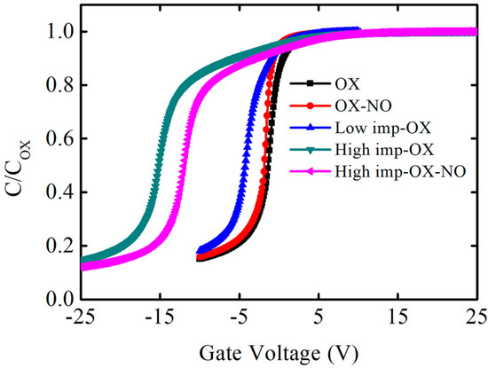 In Figure 2, another phenomenon can be observed: the capacitance–voltage curves of the pretreatment samples shifted significantly to the left, and the flatband voltage was more negative, indicating that the shift values were also related to the implantation dosage, while the high phosphorus concentration introduced more positive charges and the shift value was more pronounced. These findings are similar to the results concerning nitrogen-related gas passivation. Compared to the OX condition sample, the flatband voltage of the OX-NO condition sample shifted slightly to the left, indicating that nitrogen passivation can cause hole traps. As discussed by S. DIMITRIJEV et al., excess nitrogen at the SiO2/SiC interface resulted in a larger flatband voltage shift [40], and excess nitrogen introduced more positive charges. It can also be observed from the capacitance–voltage curves in Figure 2 that the flatband voltage of the OX-NO sample has shifted to the left compared to that of the OX sample. Note that the flatband voltage is determined by the metal-semiconductor work function difference , the fixed charge , the interface traps , the mobile ions , and the oxide traps , as shown in Formula (3). COX represents the oxidation film capacitance, and is the position of trap charges in the oxidation film. The left shift of the flatband voltage is attributed to phosphorus fixed charges or phosphorus mobile ions. The introduced positive charges caused a relatively negative flatband voltage. The large number of positive charges caused by the pretreatment dominated the effect on the flatband voltage, and the negative flatband voltage shift was more significant. Some samples were annealed with nitric oxide gas after oxidation to further reduce the SiO2/SiC interface defects; however, compared to the high-imp-OX sample, the leftward flatband voltage shift of the high-imp-OX-NO sample was not very significant, which can be explained as follows: when the nitrogen passivated the SiO2/SiC interface, there were still traps in the oxidation film, and thus electrons were captured by oxidation traps, causing the flatband voltage to shift to the right [41]. Annealing in a nitric oxide atmosphere can reduce the interface state density and flatband voltage shift.