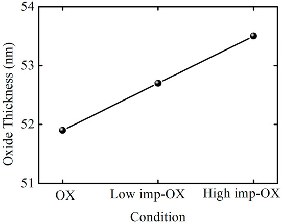 One phenomenon can be distinctly observed in the capacitance–voltage curves: pre-implantation before oxidation can increase the oxidation film’s thickness within the same oxidation time, indicating that the SiC oxidation rate increases with the implantation dosage. Figure 3 shows the oxidation film thickness variation trend under different pretreatment conditions; in order to evaluate the effect of pretreatment on oxidation rate, OX, low-imp-OX, and high-imp-OX samples were selected for analysis. Thus, it was determined that the oxidation film thickness was the lowest under the OX condition, whereas the oxidation film thickness increased after the pretreatment. Thus, the SiC oxidation rate can be correlated with the pretreatment conditions. The increase in oxidation film thickness is associated with an increase in the oxidation rate of ion-damaged or amorphized SiC [36,37]. The pretreatment increased the SiC oxidation rate, which may be related to the fact that the results were interpreted using a modified Deal–Grove model. Increasing the amount of phosphorus led to an increase in the linear rate constant factor and the parabolic rate constant factor. The increase in the linear rate constant was attributed to defects from the doping-induced lattice mismatch, and the increase in the diffusion-limited parabolic rate constant was attributed to the degradation of the oxidation film’s quality originating from the doping-induced lattice mismatch; pre-implantation oxidation increased the activation energy of the SiC oxidation reaction, resulting in higher oxidation reaction activity [38]. The increased activation energy was attributed to the higher phosphorus concentration, as the higher phosphorus concentration induced the amorphized SiC crystal phenomenon, and it can be assumed that the chemical bonding was more covalent in the amorphous phase than in the crystalline phase [39]. In Figure 3, it can be seen that the high-imp-ox sample had a faster oxidation rate, and we believe that the activation energy of the oxidation reaction in this sample group was higher during the SiC oxidation reaction, wherein chemical bonds were more covalent in the amorphous phase than in the crystalline phase.