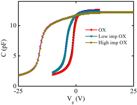 To confirm the phosphorus-positive charge types, the capacitance–voltage hysteresis characteristics were identified, and the capacitance–voltage hysteresis curves were scanned; firstly, the capacitance–voltage curve was scanned from the negative voltage depletion region to the positive voltage accumulation region, and then the capacitance–voltage curve was scanned from the positive voltage accumulation region to the negative voltage depletion region. The voltage-scanning frequency was 1 MHZ, and the voltage step was 0.1 V. Figure 4 shows the capacitance–voltage hysteresis characteristics of the samples under different implantation conditions (OX, low-imp-OX, and high-imp-OX). Mobile charges drift during the forward- and reverse-scanning process, causing a shift in the flatband voltage. The forward and reverse capacitance–voltage curves of the three condition samples were approximately coincident, with no significant difference found. Phosphorus charges do not exhibit mobile behavior and are more likely to be fixed charges.