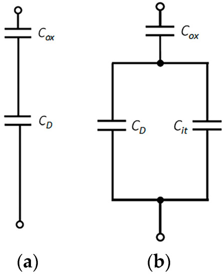 The equivalent circuit of the capacitor structure under a high-frequency signal and quasi-static signal is shown in Figure 5. Cox is the oxidation film capacitance and CD is the semiconductor space-charge-region capacitance. When the metal electrode of the capacitor is loaded with a high-frequency signal, the charging and discharging of the interface states cannot keep pace with the voltage signal, and the capacitance related to the interface states does not contribute to the high-frequency capacitance. When the applied direct current bias voltage and the applied signal frequency change slowly, the charging and discharging of the interface states always keep pace with the change in the voltage signal. Thus, the influence of the interface states’ capacitance must be considered, as shown in Figure 5b, where Cit is the interface states’ capacitance of the low-frequency equivalent circuit. In Figure 5b, the equivalent capacitance at a low frequency was obtained as Formula (5), and the equivalent capacitance at a high frequency was obtained as Formula (6).