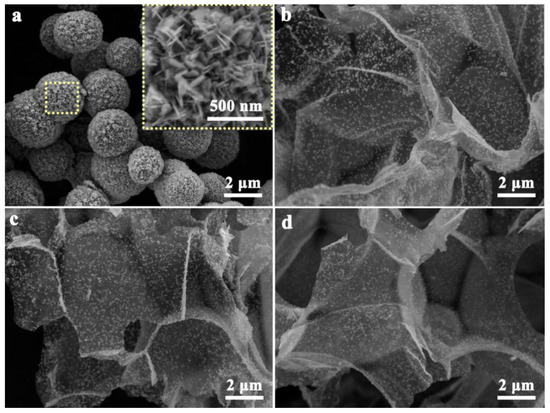 SEM images of BMO (a), BMO/NO-C-5 (b), BMO/NO-C-7 (c), and BMO/NO-C-9 (d).