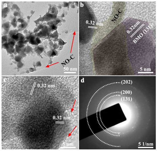 The selected area electron diffraction (SAED) of BMO/NO-C-7 is shown in Figure 3d. The white dashed lines are the Bi2MoO6 (131), (200), and (202) crystal planes. The SAED results are consistent with the XRD ones.