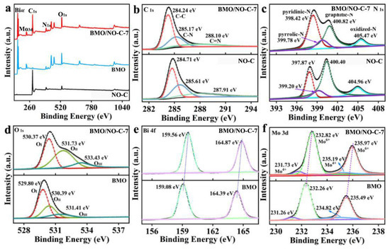 (a) XPS survey spectra of BMO, NO-C, and BMO/NO-C-7. High-resolution XPS spectra of (b) C 1s, (c) N 1s, (d) O 1s (e) Bi 4f, and (f) Mo 3d of the BMO and BMO/NO-C-7.