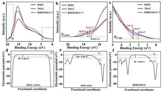 Ultraviolet photoelectron spectroscopy (UPS) was employed to measure the valence band (VB) and the conduction band (CB) of the BMO, NO-C, and BMO/NO-C composite, shown in Figure 6a. The Ecutoff energies of BMO, NO-C, and BMO/NO-C are 18.51, 18.75, and 18.62 eV, respectively (Figure 6b), while the EF-edge energies for three catalysts were 2.63, 2.04, and 2.68 eV, respectively (Figure 6c). Based on the equation EVB = −IP (ionization potential) = −(hν − (Ecutoff − EF-edge)), where hν is the He I photon source energy (21.21 eV), the valence band energies (EVB) of BMO, NO-C, and BMO/NO-C are −5.33, −4.50, and −5.27 eV, respectively [57,58]. According to the equation ECB = EVB + Eg (the Eg energies were taken from Figure 5), the conduction band energies (ECB) for BMO, NO-C, and BMO/NO-C are −2.24, −1.72 and −2.20 eV, respectively [59]. Significantly, the Fermi level of BMO is lower than that of NO-C, indicating that electrons are transferred from NO-C to BMO and form heterojunctions [60,61,62]. The DFT calculated work functions (Φ) of NO-C and BMO are 3.46 eV and 4.40 eV, respectively (Figure 6d,e), which is consistent with the experimental results that the EF of NO-C is higher than that of BMO. When BMO and NO-C are in contact to form a composite, electrons spontaneously transfer from NO-C to BMO until reaching equilibrium [63]. Φ of the BMO/NO-C heterojunction is 3.88 eV (Figure 6f), which is between the work functions of BMO and NO-C. In the BMO/NO-C composite, the BMO accumulates some negative charge, whereas the NO-C layer accumulates some positive charges, which is confirmed by the differential charge density analysis of DFT calculations (Figure S3d). The accumulated positive charges on NO-C and negative charges on BMO induce an internal electric field from NO-C to BMO. It is worth mentioning that the internal electric field at the interface exerts electrostatic forces on the photogenerated holes and electrons, forming a heterojunction for photocatalytic carrier separation and diffusion [64,65].