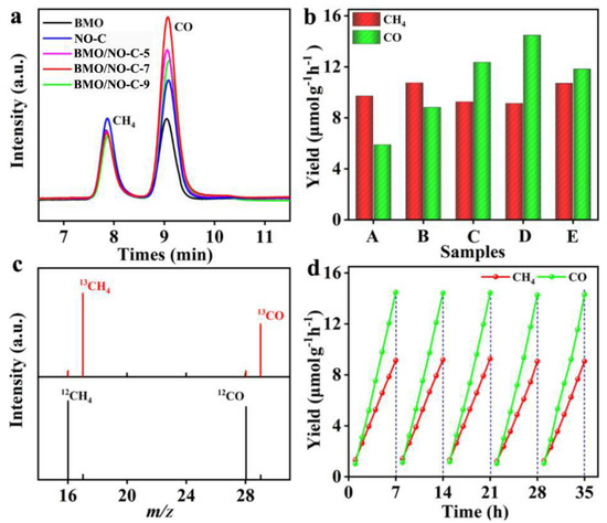 To determine the photocatalytic performance of the BMO/NO-C catalysts, we performed photocatalytic CO2 reduction experiments with the Labsolar 6A system from Beijing Perfectlight Technology Co., Ltd., (Beijing, China) which is an all-glass automatic online trace gas analysis system coupled with a 300 W Xenon lamp source (Microsolar300, Figure S4). Figure 7a shows that CH4 and CO are the main products of photocatalytic CO2 reduction, and Figure 7b compares the photocatalytic CO2 reduction performances for all catalysts. The BMO/NO-C-7 catalyst exhibited superior CH4 and CO yields of 9.14 μmol g−1 h−1 and 14.49 μmol g−1 h−1, respectively.