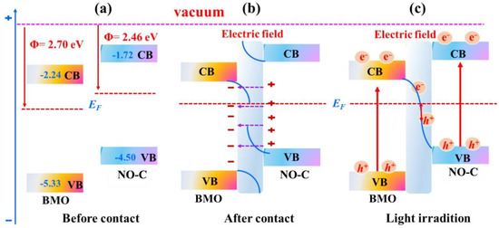 Diagram of the band edge positions before (a) and after contact (b) of BMO and NO-C. (c) The step-scheme electrons transfer diagram between BMO and NO-C under the full spectrum.