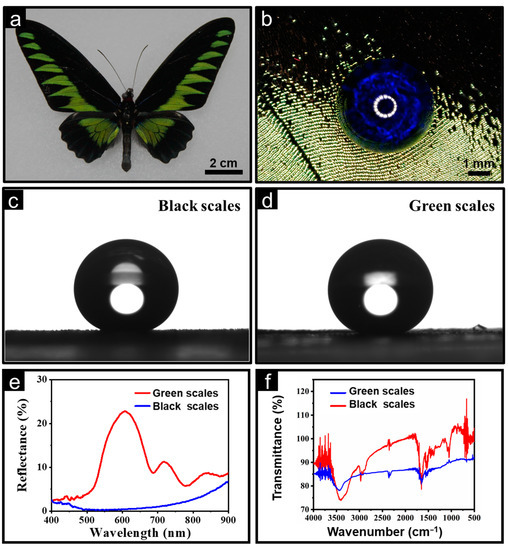 Characteristics of butterfly wings. (a) Overall view of the butterfly. (b) Water contact angles of the butterfly wing. (c) Water contact angles of black scales. (d) Water contact angles of green scales. (e) The reflectance of the butterfly wings. (f) FTIR spectra analysis of butterfly wings.