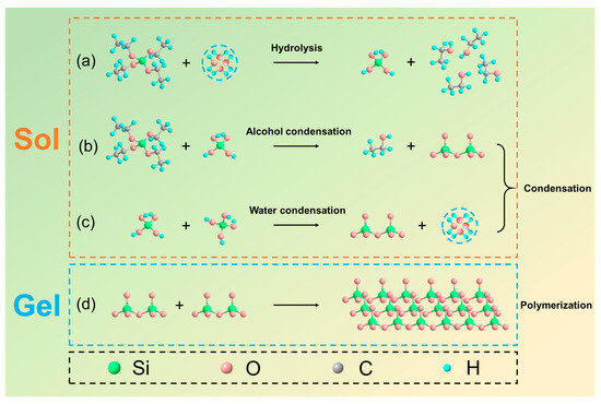 Reaction mechanism of the BFRSs. (a–c) Hydrolysis and condensation reaction of TEOS. (d) Polymerization reaction of SiO2.