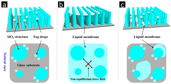 Anti-fog mechanism analysis of BFRSs. (a) Fog capture stage. (b) Water film tearing stage. (c) Fog removal stage.