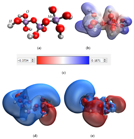 Results of quantum chemical modeling of MnO2 molecule: model of the molecule (a), electron density distribution (b), electron density distribution gradient (c), HOMO molecular orbital (d), LUMO molecular orbital (e).